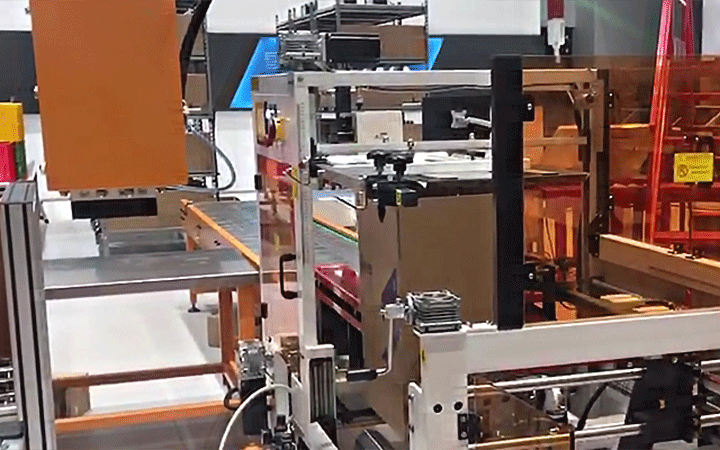 自動(dòng)拆箱機(jī)自動(dòng)完成開箱、成形、下底折葉折曲。并現(xiàn)時(shí)完成下部分膠帶粘貼,將疊成紙板的箱板自動(dòng)打開,箱子底部按一定程序折合,并用膠帶密封后輸送給裝箱機(jī)的專用設(shè)備。
