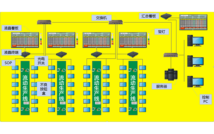 生產(chǎn)管理看板系統(tǒng)是指用于車間或生產(chǎn)線目視化管理(VM,Visual Management)的一種表現(xiàn)形式,即對數(shù)據(jù)、生產(chǎn)狀態(tài)等的情況一目了然地表現(xiàn),主要是對于生產(chǎn)進(jìn)度、生產(chǎn)狀態(tài)進(jìn)行的透明化管理設(shè)備。電子看板則通過利用形象直觀而又色彩適宜的各種視覺感知信息來組織現(xiàn)場生產(chǎn)活動(dòng),了解實(shí)時(shí)的生產(chǎn)進(jìn)度、產(chǎn)能、以及不良數(shù)等等。生產(chǎn)管理看板是發(fā)現(xiàn)問題、解決問題的非常有效且直觀的手段,是優(yōu)異的現(xiàn)場管理必不可少的工具之一;它是6s的基本工具。