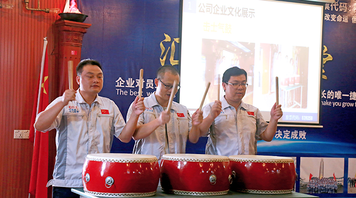 會議由行政部經(jīng)理袁侃主持。會議在激昂的《匯興之歌——用心智造世界》 拉開帷幕,全體參會人員向企業(yè)核心價值觀“孝道、商道、人道”行三鞠躬禮,宣讀企業(yè)愿景——成為全球領(lǐng)先的整廠自動化系統(tǒng)解決方案提供商,企業(yè)使命——做受尊敬的好人、造受尊敬的產(chǎn)品、辦受尊敬的企業(yè)、建受尊敬的平臺,企業(yè)精神——用情做人、用心做事,團(tuán)隊精神——忠誠團(tuán)結(jié)、勤奮進(jìn)取。隨后,匯興智造干部職員代表鐘建輝、彭大海,鄭建團(tuán)共同敲響士氣鼓,鼓舞匯興智造牢記初心,砥礪前行。