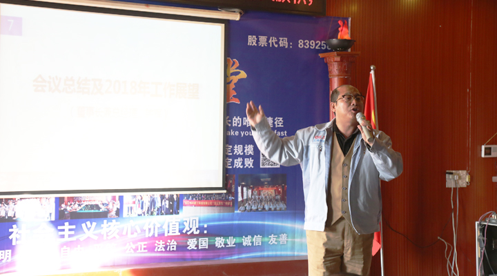 大會(huì)的最后一個(gè)議程是匯興智造鐘輝董事長(zhǎng)作會(huì)議總結(jié)及2018年工作展望。鐘輝董事長(zhǎng)說道:“我們報(bào)喜不藏憂,變化不變心。2017年,匯興智造喜事不斷:入選東莞市倍增計(jì)劃試點(diǎn)企業(yè);成立東莞市院士工作站;進(jìn)入新三板創(chuàng)新層;獲批了35畝企業(yè)用地;市重大項(xiàng)目補(bǔ)助落實(shí);德國(guó)子公司建立;在國(guó)際科技合作周活動(dòng)中,承辦的德國(guó)館和論壇萬眾矚目,省長(zhǎng)、各部級(jí)領(lǐng)導(dǎo)、院士大加贊賞;申報(bào)了廣東省成長(zhǎng)型企業(yè);戰(zhàn)略性新興產(chǎn)業(yè)骨干(培育)企業(yè)評(píng)審?fù)ㄟ^;銀行授信額度增大;知識(shí)產(chǎn)權(quán)貫標(biāo);業(yè)績(jī)倍增,納稅1000多萬,成為大嶺山鎮(zhèn)納稅大戶。雖然我們?nèi)〉昧撕玫某煽?jī),獲得了好的聲譽(yù),但我們不能藏憂,人才建設(shè)的加強(qiáng);管理制度的完善;銷售業(yè)績(jī)的增長(zhǎng);訂單的消化;收款流程的優(yōu)化;各部門溝通協(xié)調(diào)的加強(qiáng)等等,我們還有很多問題需要解決?!埲招?,日日新,又日新’,生活從不眷顧因循守舊、滿足現(xiàn)狀者。我們要變化,有了變化,才有進(jìn)步。我們的車間變得更規(guī)范,辦公區(qū)域變得更漂亮;供應(yīng)商變得更優(yōu)質(zhì);我們提供給客戶的產(chǎn)品和服務(wù)變得更豐富;客戶群體變得更高端。但是不管怎么變,任爾東西南北風(fēng),在即將到來的2018年,我們?nèi)匀粓?jiān)守初心,牢記使命,砥礪前行?!?nbsp;