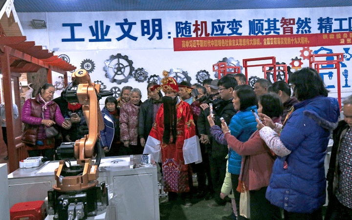 活動(dòng)現(xiàn)場(chǎng),匯興智造黨支部、工會(huì)委員會(huì)、團(tuán)工委等工作人員裝扮成財(cái)神為老人送上新年利是,陪伴老人一同參觀匯興智造工業(yè)4.0智能裝備體驗(yàn)館,體驗(yàn)智能制造“隨機(jī)應(yīng)變”“順其智然”改變傳統(tǒng)生產(chǎn)的魅力;觀看由匯興智造員工自編自演的京劇舞蹈廠歌等文藝節(jié)目,感受匯興智造“用情做人、用心做事”,“敬天愛(ài)人,孝道為先”的文化力量。