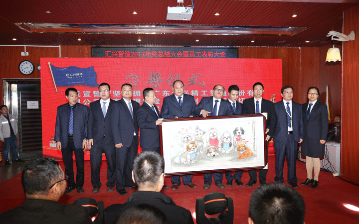 晚會(huì)現(xiàn)場(chǎng),匯興智造董事會(huì)、監(jiān)事會(huì)成員登臺(tái)舉行宣誓儀式,為2018沖鋒表決心、擂戰(zhàn)鼓,確保公司在2020年前實(shí)現(xiàn)效率倍增、業(yè)績(jī)倍增、效益倍增,成功登陸創(chuàng)業(yè)板。儀式結(jié)束后,宣誓成員們圍繞在梁培浩教授贈(zèng)送的畫(huà)作《大吉大利》周?chē)栌卯?huà)上8只憨態(tài)可掬的小狗送出“旺狗賀歲、歡樂(lè)祥瑞”的祝福。8,既代表2018,也代表“發(fā)”,祝福匯興智造在2018大發(fā)展,創(chuàng)新高。