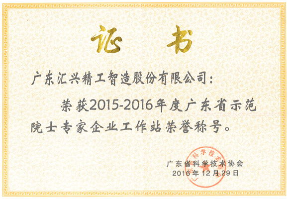 匯興智造廣東省示范院士專家企業(yè)工作站榮譽(yù)證書(shū)