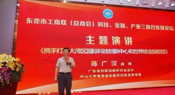 大會(huì)還邀請(qǐng)廣東省創(chuàng)新戰(zhàn)略研究會(huì)會(huì)長(zhǎng)、中山大學(xué)粵港澳發(fā)展研究院首席專家陳廣漢教授作了《攜手打造大灣區(qū)國際科技創(chuàng)新中心和世界級(jí)金融樞紐》主題演講。陳廣漢教授就東莞在參與粵港澳大灣區(qū)建設(shè)的過程中,在推動(dòng)科技、金融、產(chǎn)業(yè)“三融合”方面的機(jī)遇與主要努力方向進(jìn)行全方位解讀。