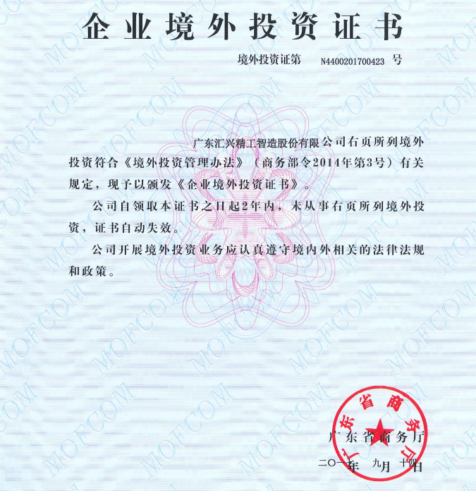 2017年8月29日,廣東匯興精工智造股份有限公司(股票代碼:839258)正式獲得企業(yè)對(duì)外投資證書。匯興智造赴德設(shè)立......