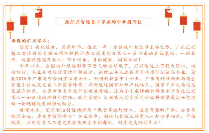 尊敬的匯興家人: 您好!金秋送爽,月滿中華。值此一年一度傳統(tǒng)中秋佳節(jié)來臨之際,廣東匯興精工智造股份有限公司......